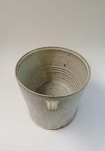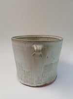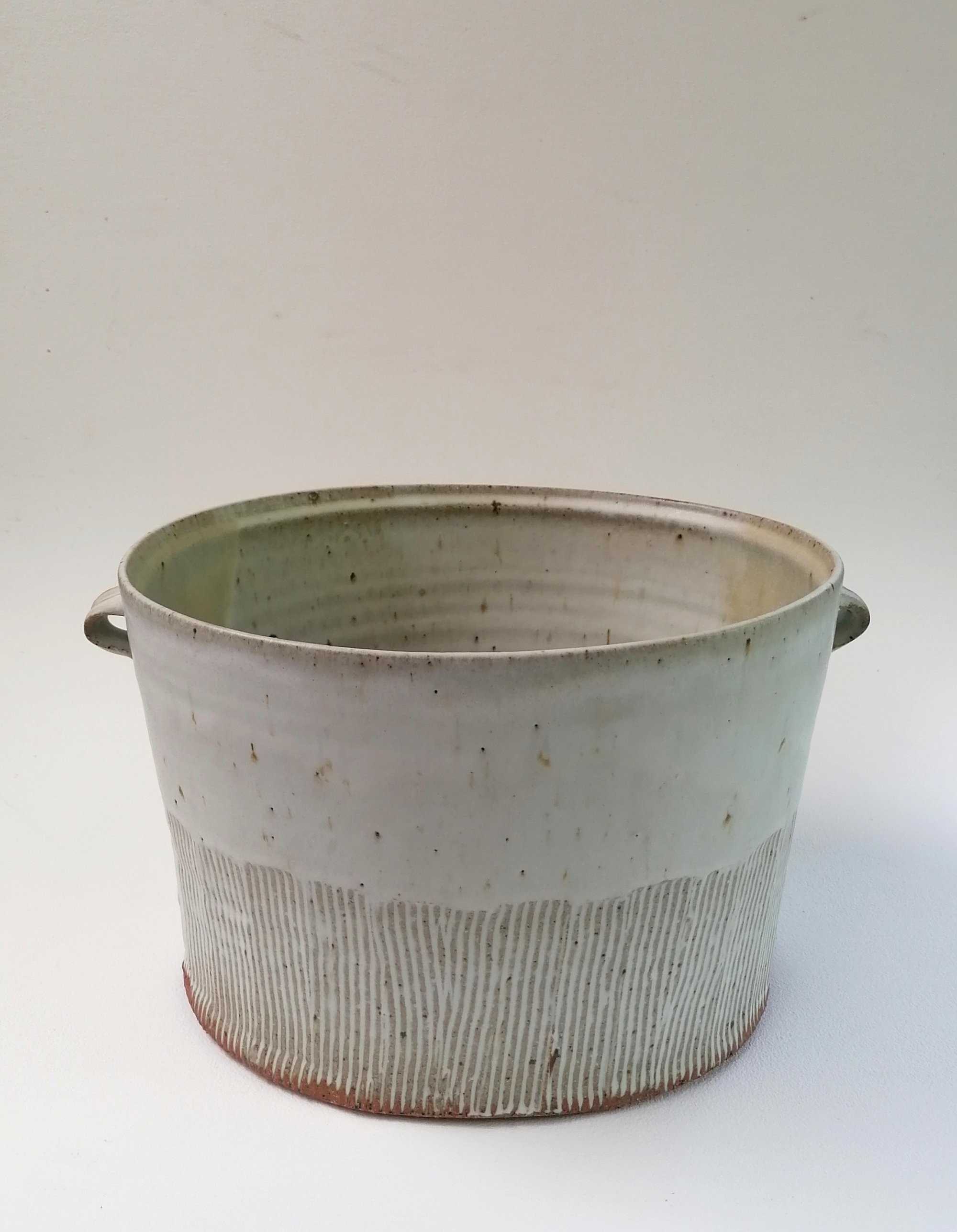 A thrown and altered bucket with vertically incised texture. Glazed with my Cornish Stone and Dolomite glaze and fluid hardwood ash glaze pours over the pulled lugs and interior.
